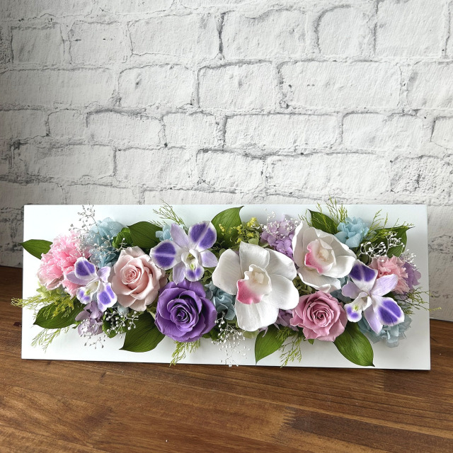 蘭の美しさと存在感が引き立つ、上品なアレンジメント。珍しいプリザーブドフラワーの花を使用した高級感もあり、目上の方への贈り物や、開業・昇進・退職などのビジネスシーン、結婚祝い、お供えなどのお花としておすすめです。