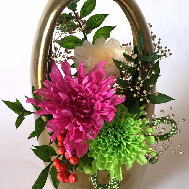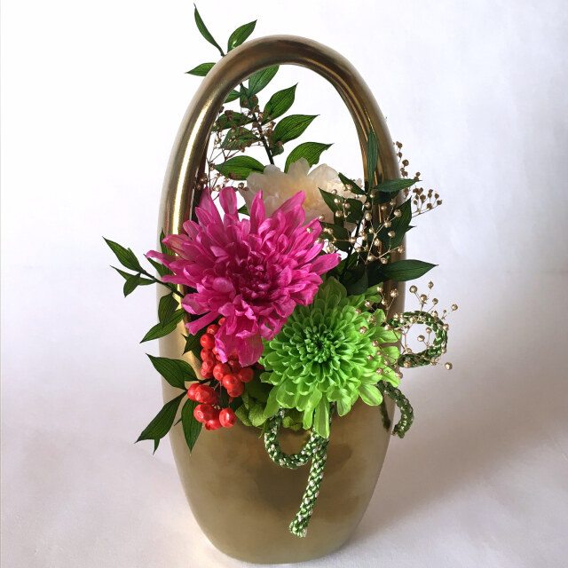 色とりどりの小菊をあしらった、華やかな和風アレンジ。 ゴールドの花器は陶器で、派手過ぎず上品な華やかさがあります。 四十九日を過ぎた特別な法要や、故人の命日の御供えにもおすすめです。