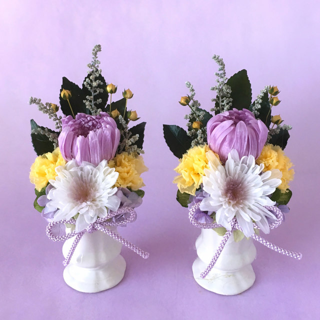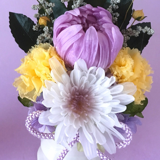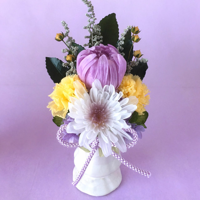 菊やカーネーションなど、優しい色合で求めた、コンパクトサイズの仏花です。小さなお仏壇や、ペットのお供えなどにおすすめのサイズです。