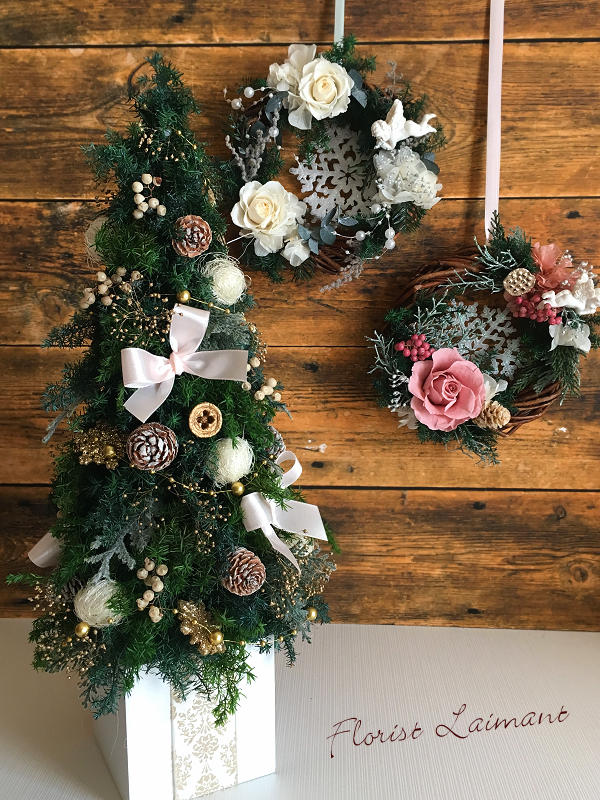 花材:(ピンク)バラ・アジサイ・ヒムロスギ・ブルーアイス・ペッパーベリー・カスミソウ(全てプリザーブドフラワー) (ホワイト)バラ・アジサイ・ヒムロスギ・ユーカリ・ストーヘ゛・カスミソウ(全てプリザーブドフラワー) 資材:(ピンク)エンジェルオーナメント・スノーオーナメント・ハスの実(ドライ)・カラマツ(ドライ) (ホワイト)エンジェルオーナメント・スノーオーナメント・パール |