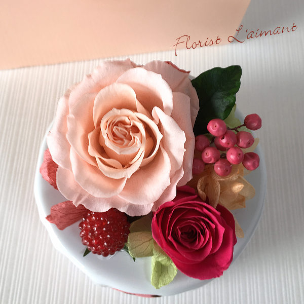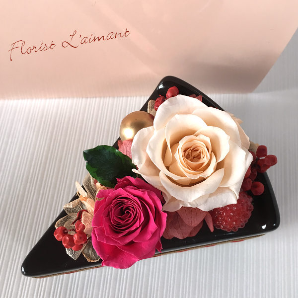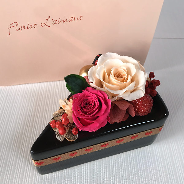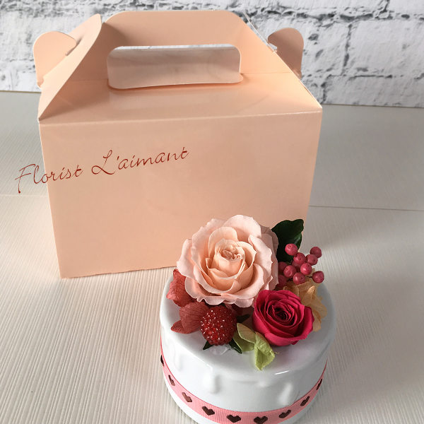 淡いピンクのケーキBOXに入れて贈るので、開けるまで、まさかお花とは気づきません。可愛らしくて美味しそうなお花のケーキに、誰もが笑顔になれそうです。