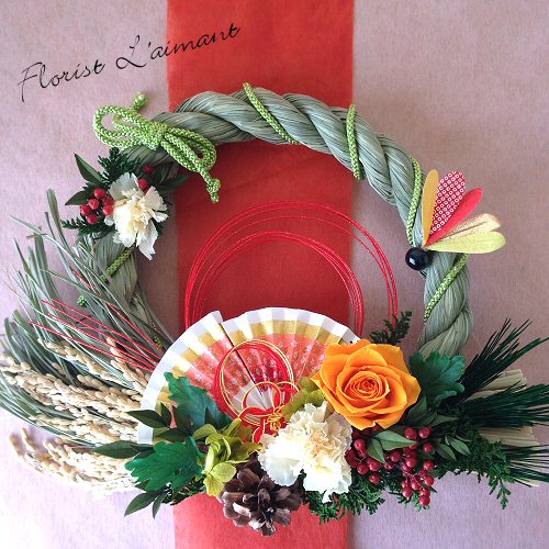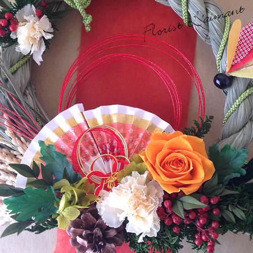 艶やかで印象的な、プリザーブドフラワーのしめ縄リースです。お玄関の中に飾って楽しむ、室内用のしめ縄飾りです。 明るいオレンジ色で華やかに。和室にも洋室にもお洒落に飾っていただけます。