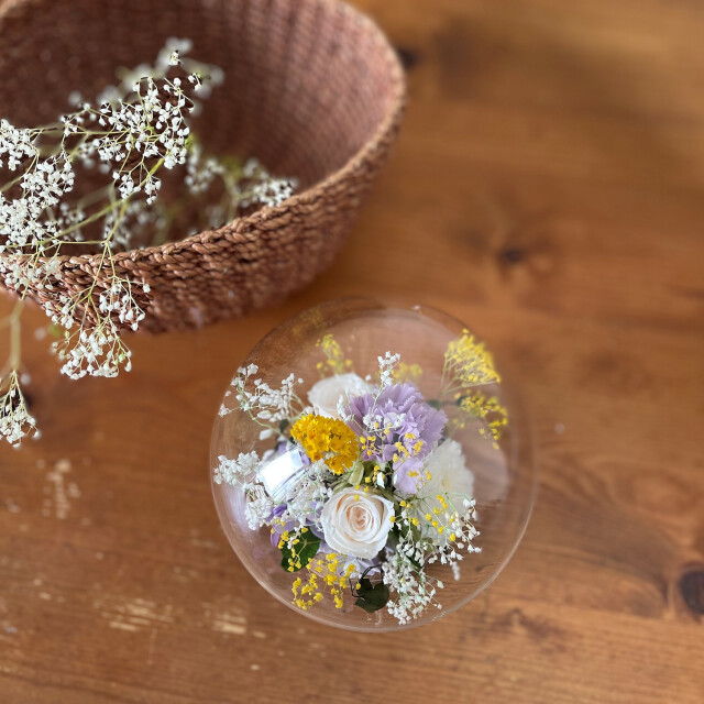 まん丸いガラスのドームの中に、繊細で可憐な小花をそっと収めました。