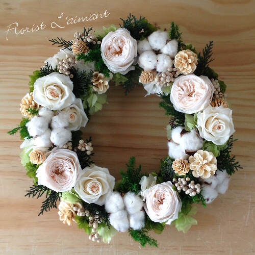 プリザーブドフラワーならではの、エバーグリーンの香りがほのかに香る、本物素材のリース達です。
